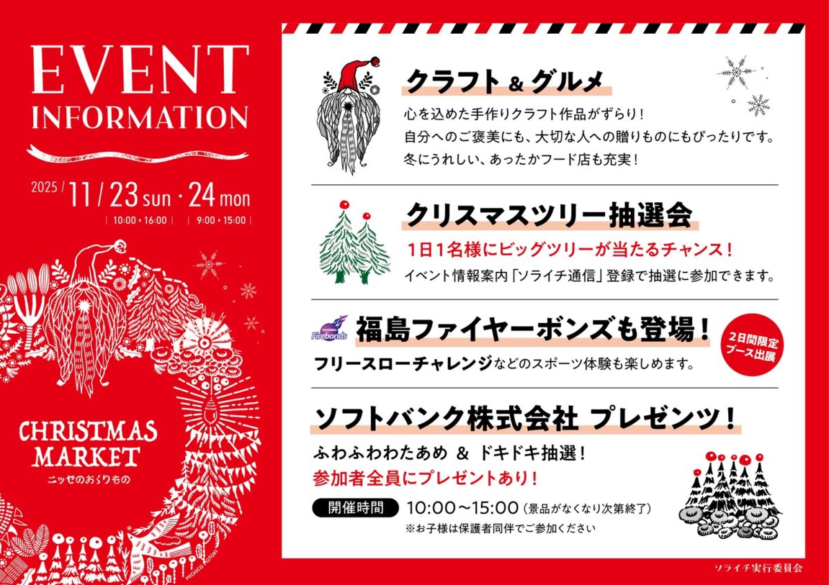 | 開催日 | 2025年 11月23日(日)10:00~16:00 11月24日(月・振替休日)9:00~15:00 ※雨天決行/荒天時は12月6日(土)・7日(日) |